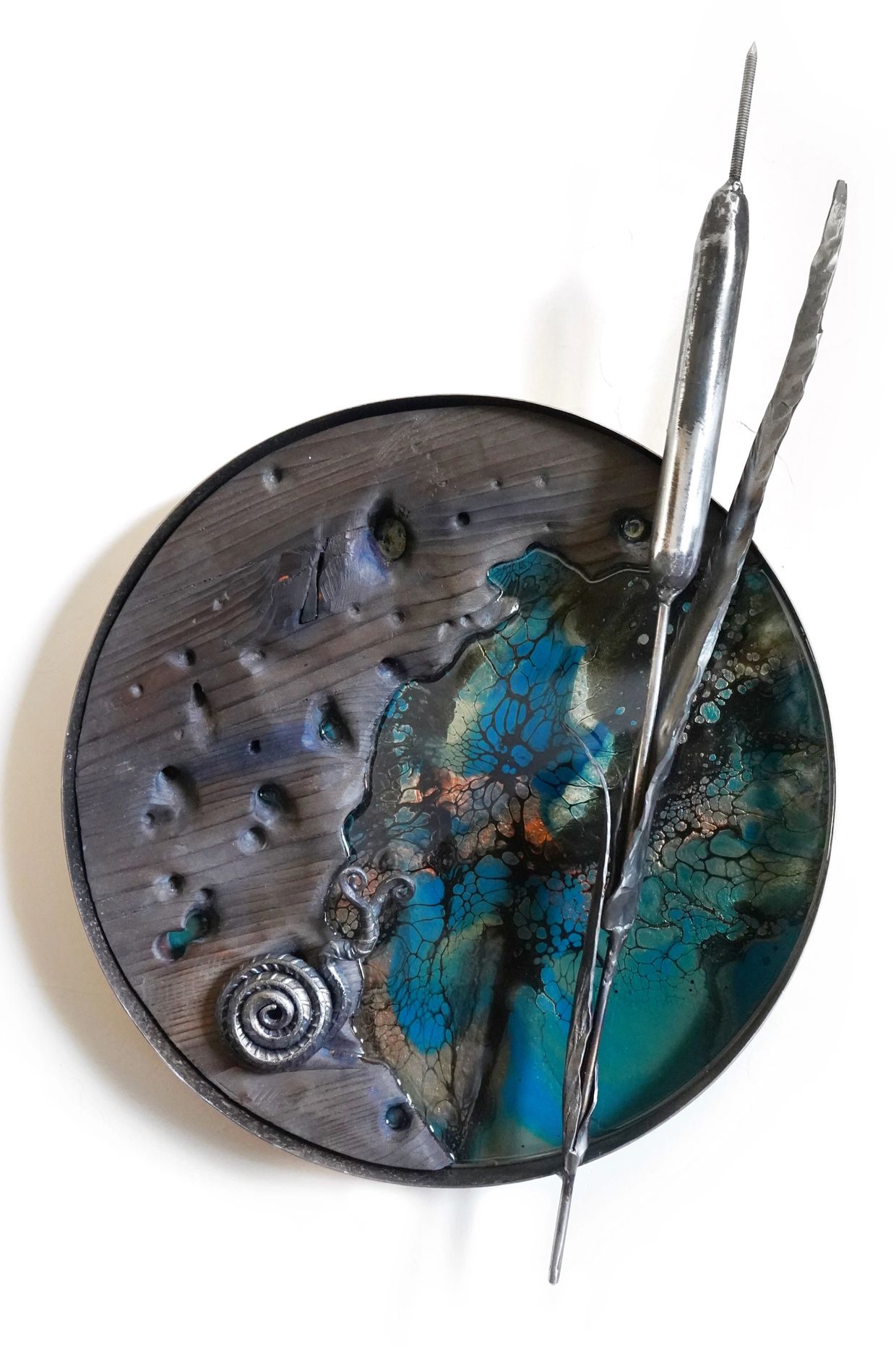 A verdant marshy acrylic and resin pond is visited by an adorable reclaimed metal snail. The scene is encircled by a carved wooden shore and reclaimed metal frame. A hand-forged cattail punctuates the piece and creates visual movement.