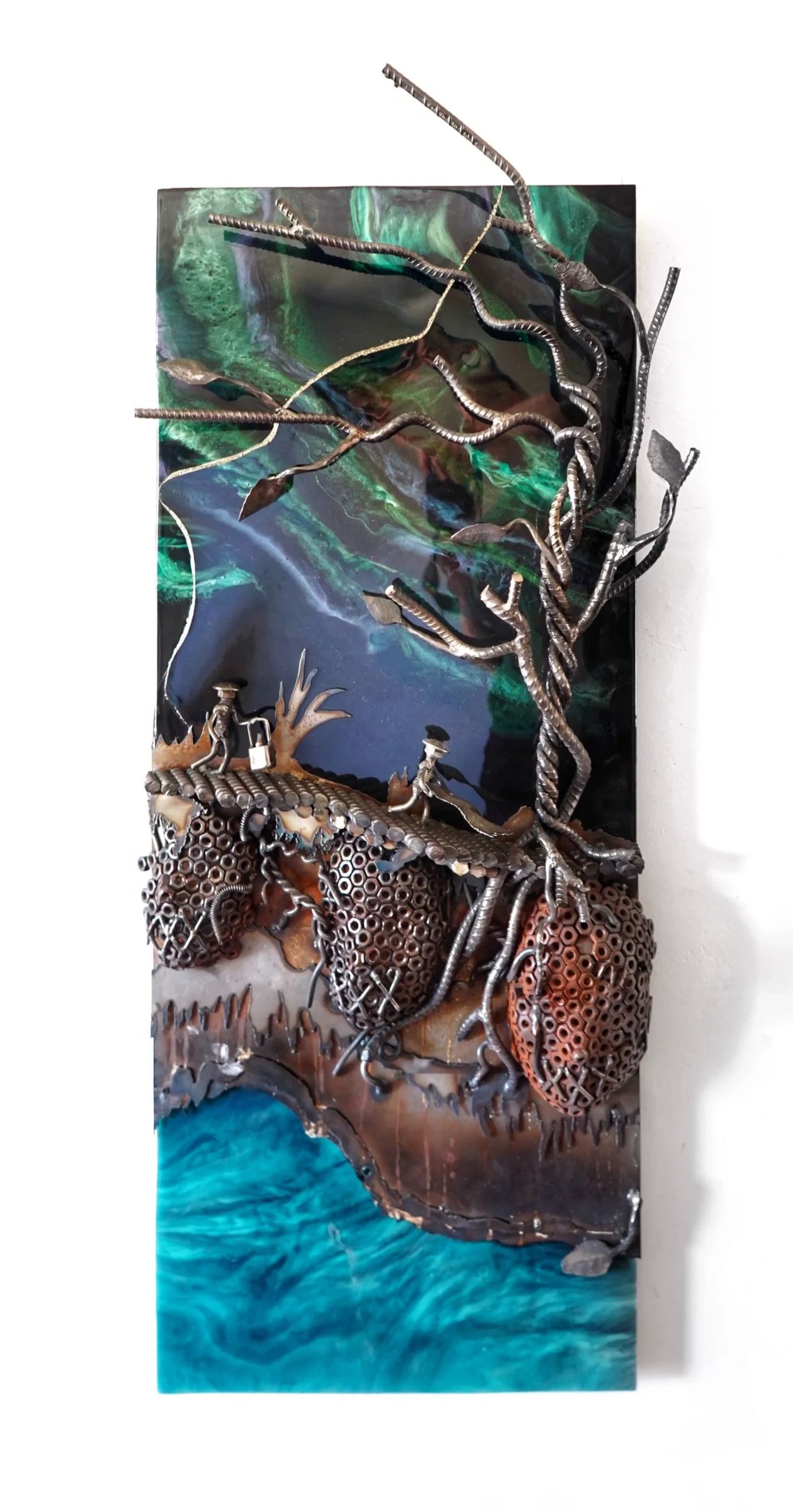 This piece was updated to make repairs to a catastrophic resin crack in a windstorm. The new work features richer resin work below the figures, and kintsugi-style repair with crushed silver glass and resin in the damaged areas.
