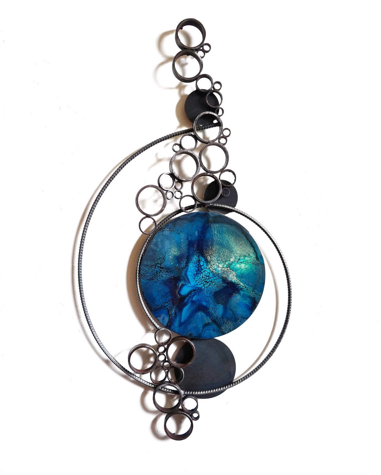 At the heart of the piece is a shimmering acrylic and resin painting in blues and greens that change with the light. Clusters of metal rings and discs invoke the feeling of musical notes and harmonies, arranged within a spiral of rebar that gives the work an overall treble clef shape. This work will sing on a sunny wall!